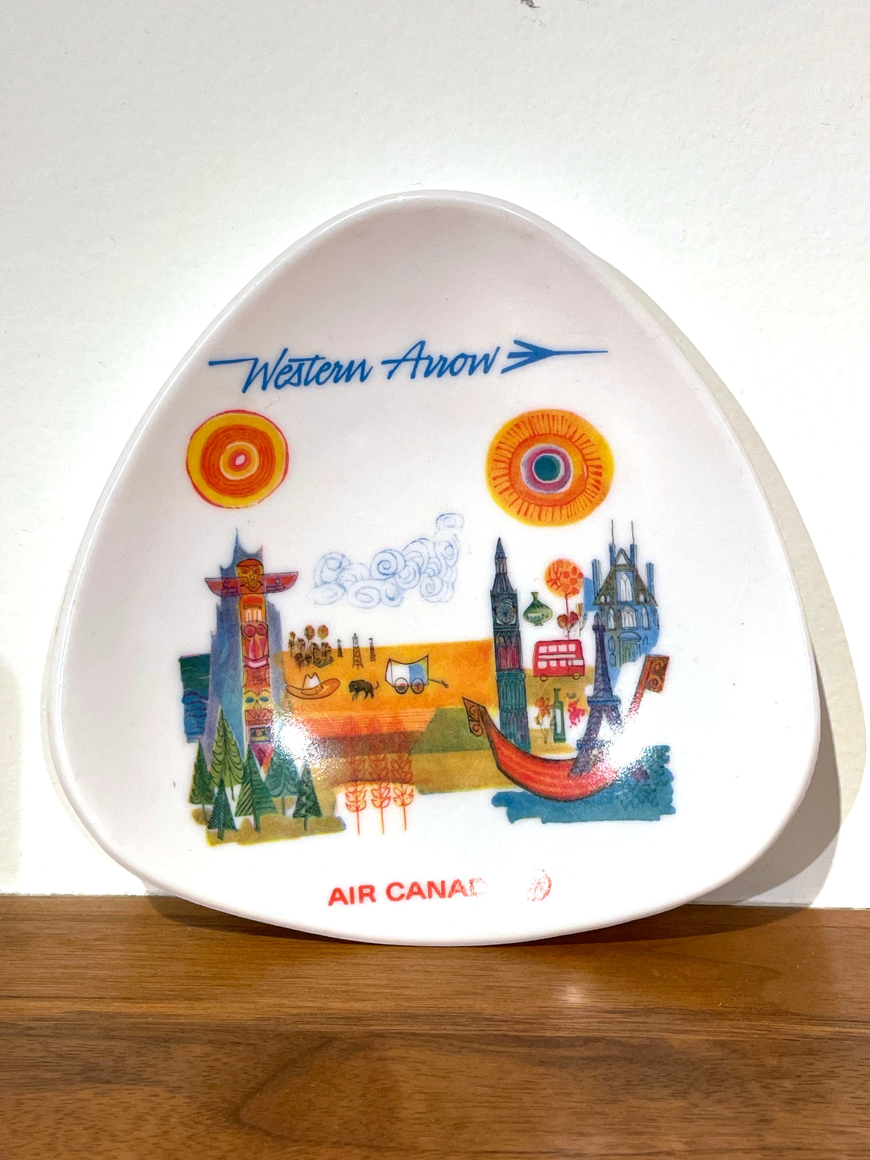 Air Canadaのメラミン樹脂製コイントレイで、幅は約13センチです。コンディションは良好、写真では絵や文字の一部が掠れているように見えますが、これはライトが反射しているせいで、実物に掠れはありません。