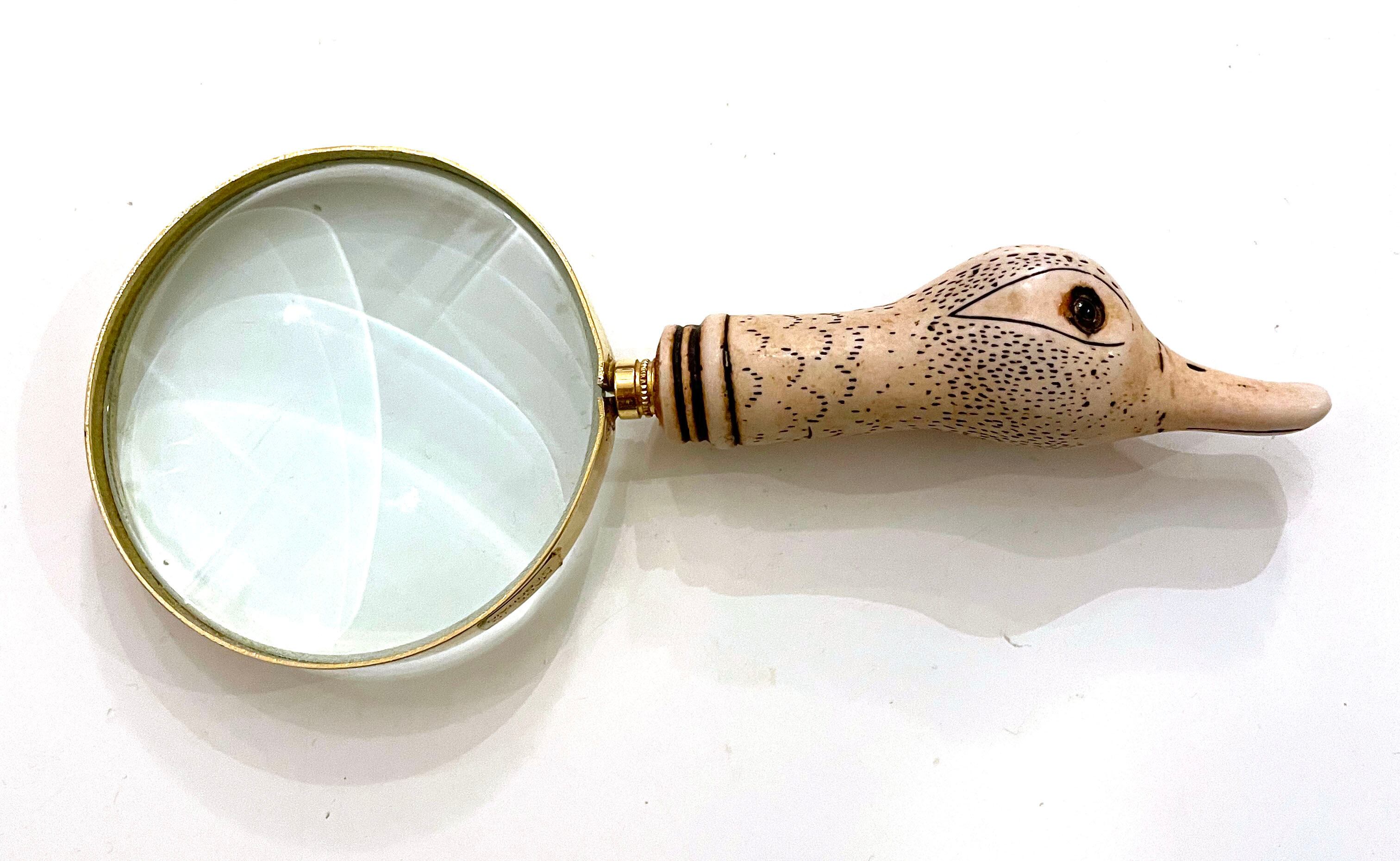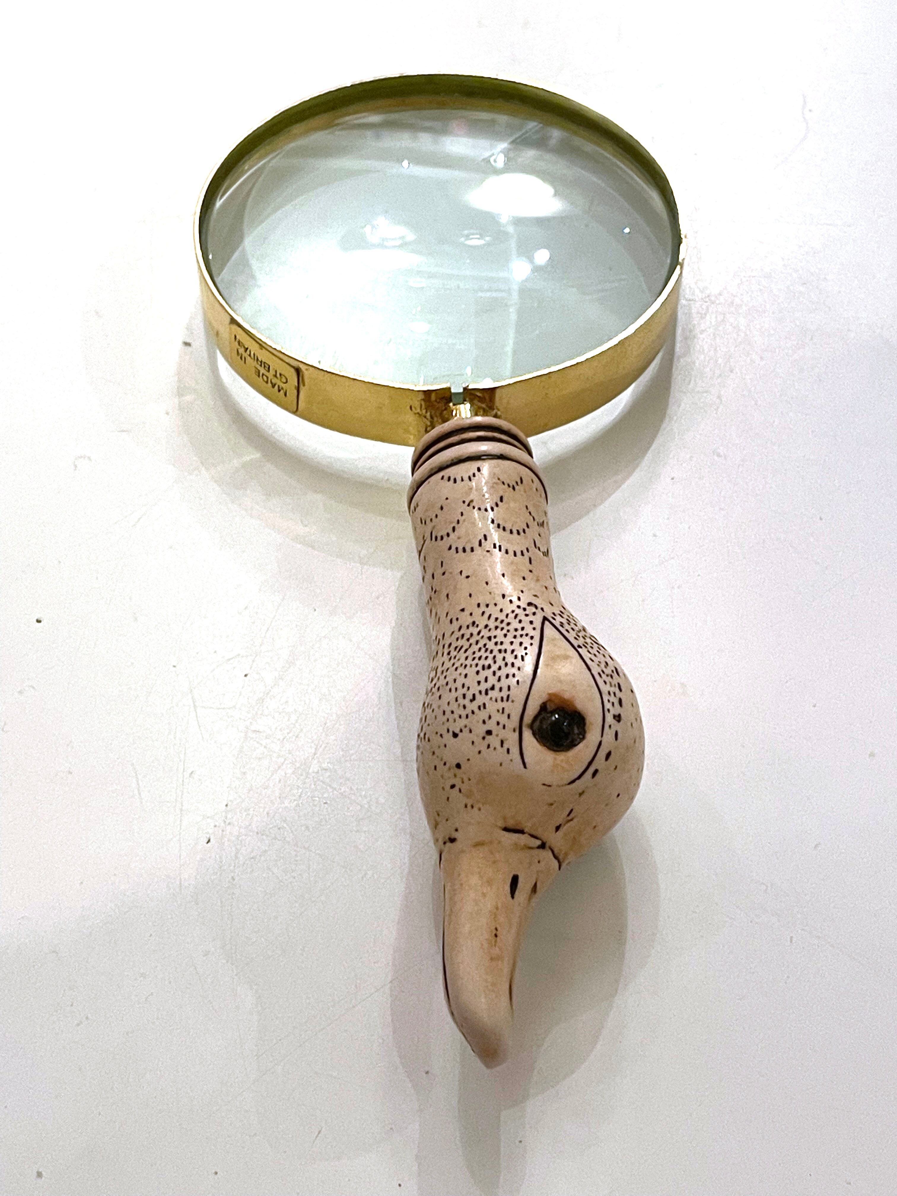 ハンドルが鳥の顔をした虫眼鏡です。いつ頃のものかはわかりません。ハンドル部分は約10.5センチ、レンズ部分は約7.7センチです。レンズのフレームには多少歪み、傷があります。Made in Great Britainのステッカーが貼ってありますので、イギリス製です。