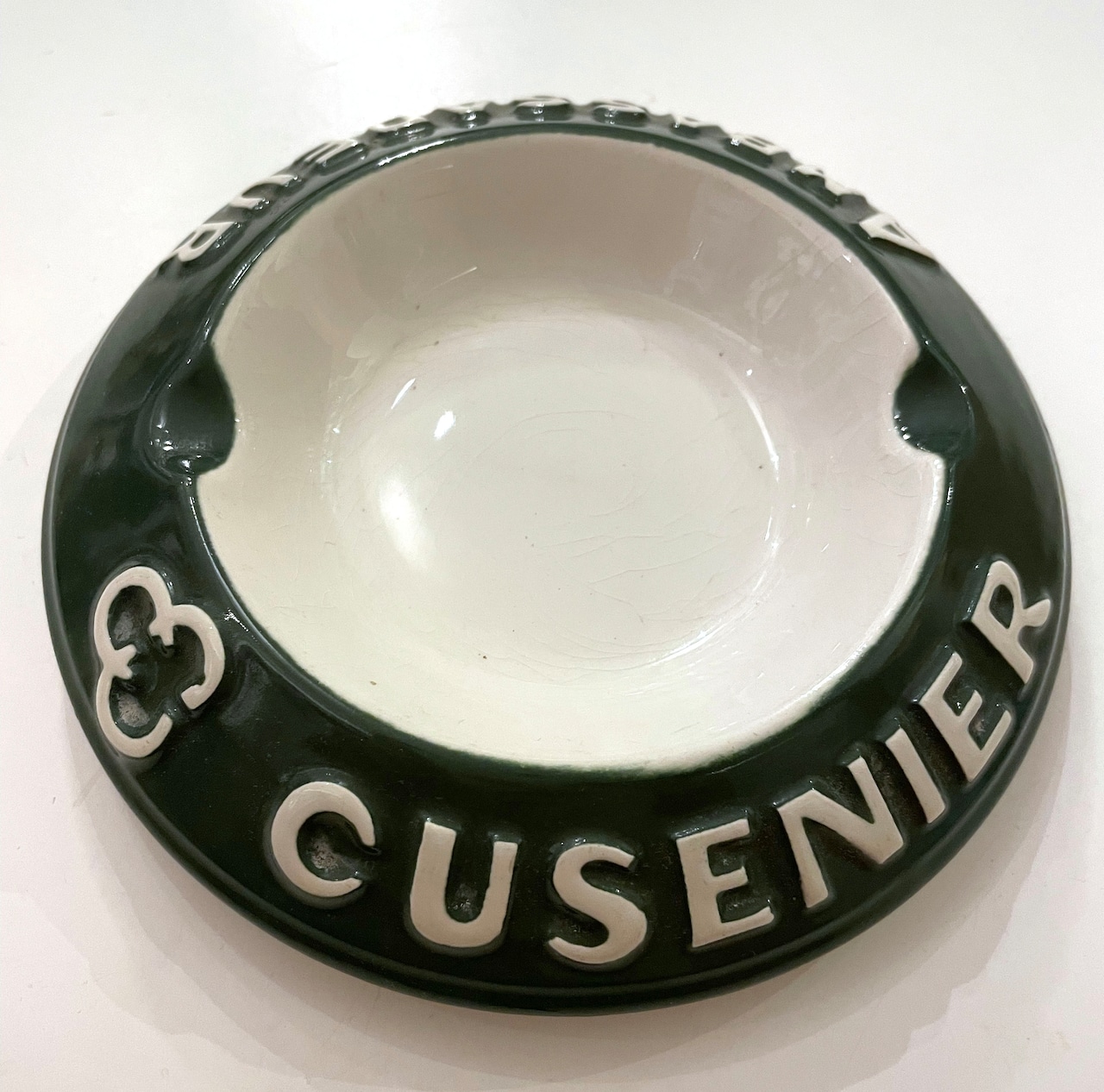 CUSENIER AMBASSADEUR(スピリッツ)のフランス製陶器灰皿です。直径は約14センチ。若干の貫入と汚れがあります。今時灰皿を使う人も少ないかもしれませんが、小物入れとしてどうぞ。