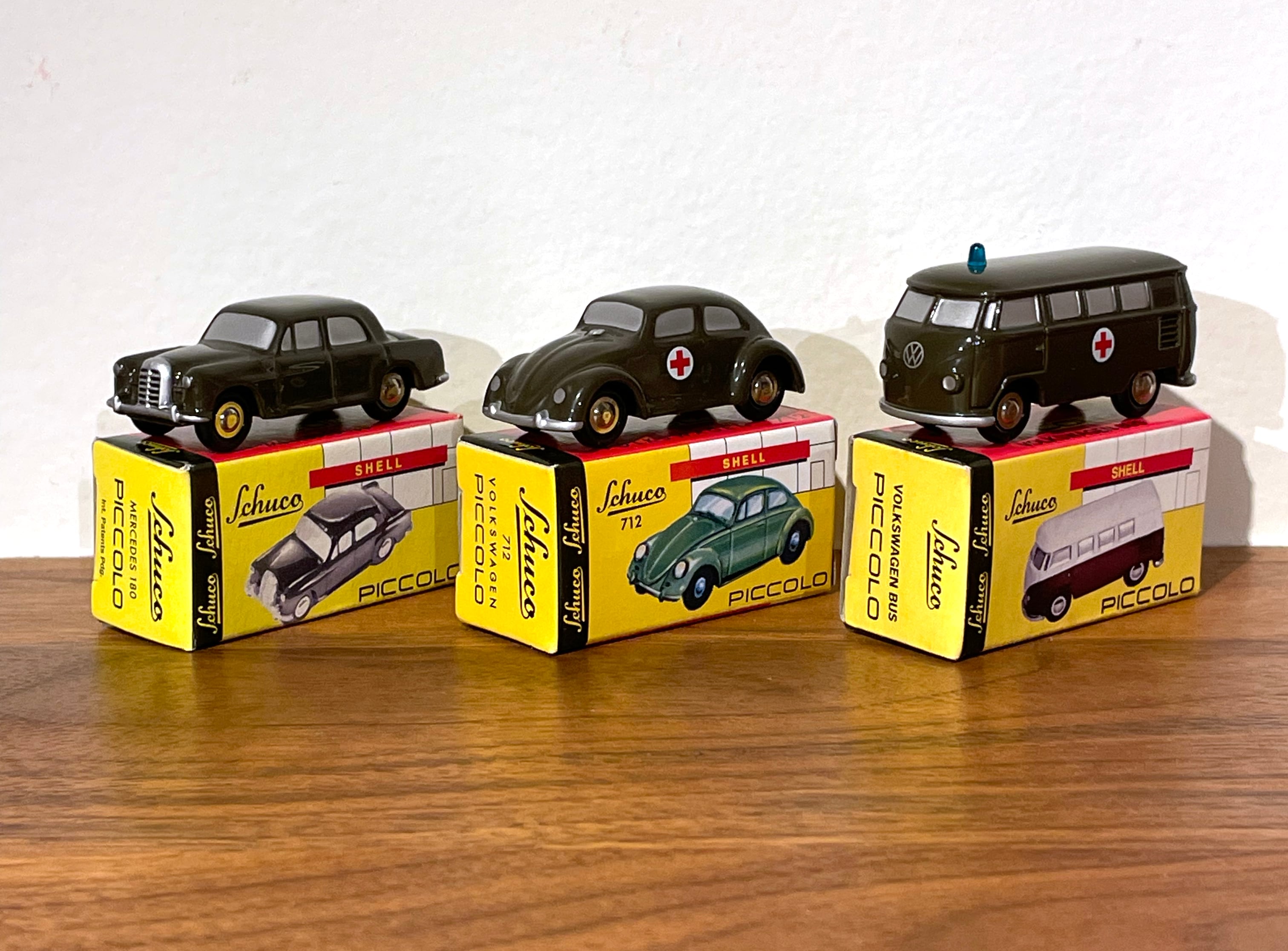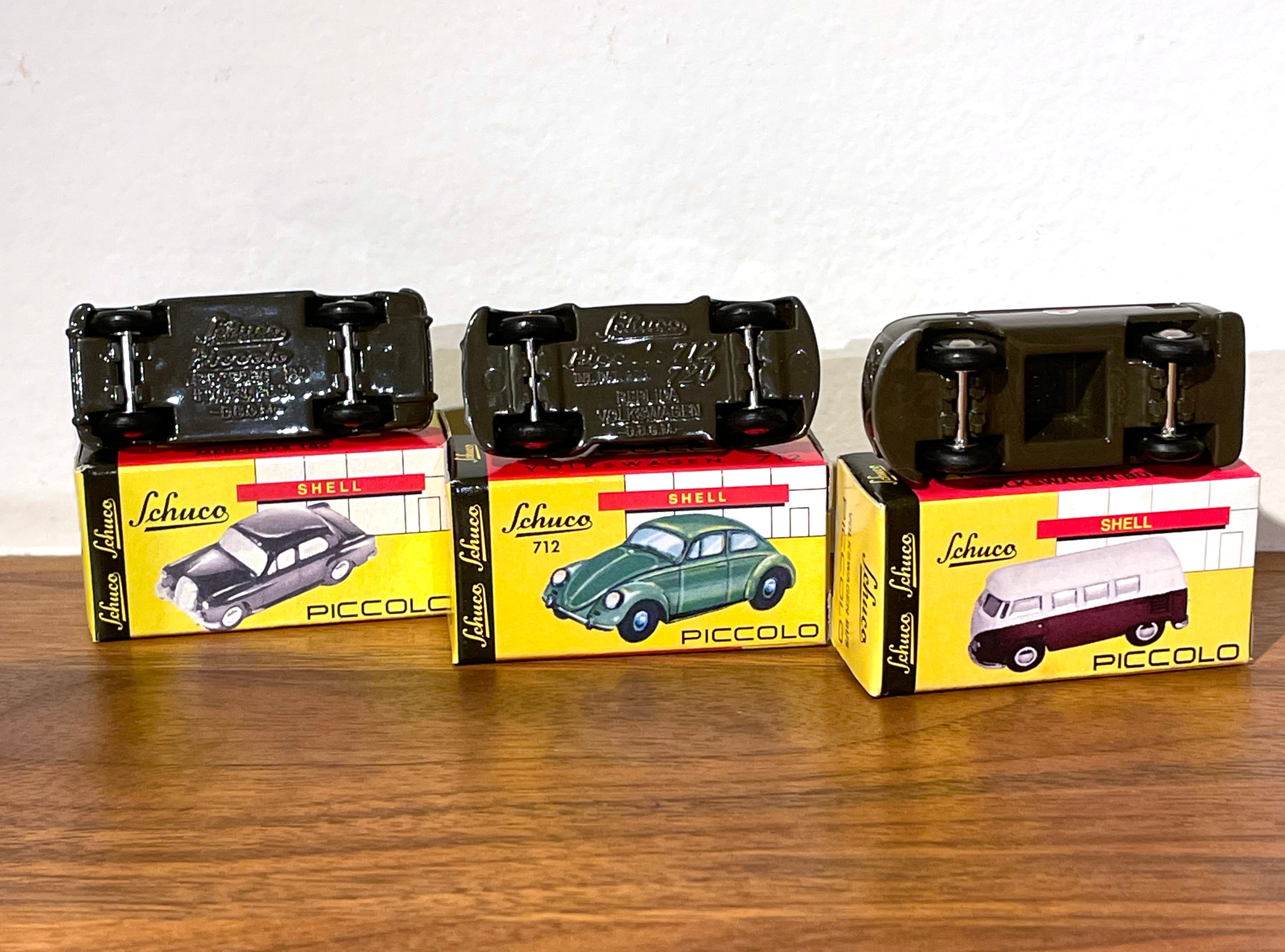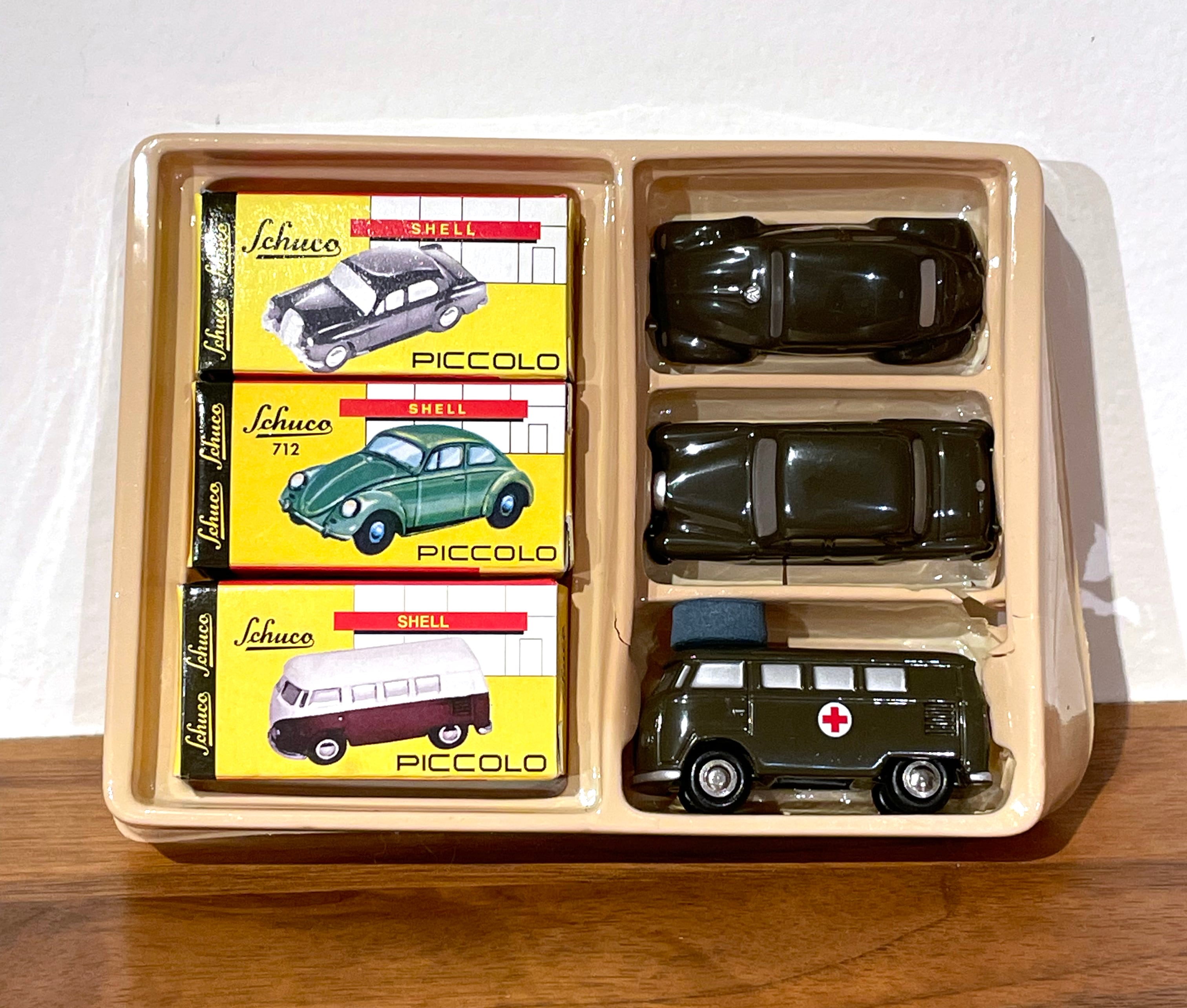 1990年代に復刻されたドイツのシュコー・ピッコロシリーズ3台セットです。ソリッドダイキャスト製で、中が詰まっているため小さいけれど重さがあります。外箱の中のプラスチックのケーシングに少し破損があります。ミニカー自体のコンディションは良好です。