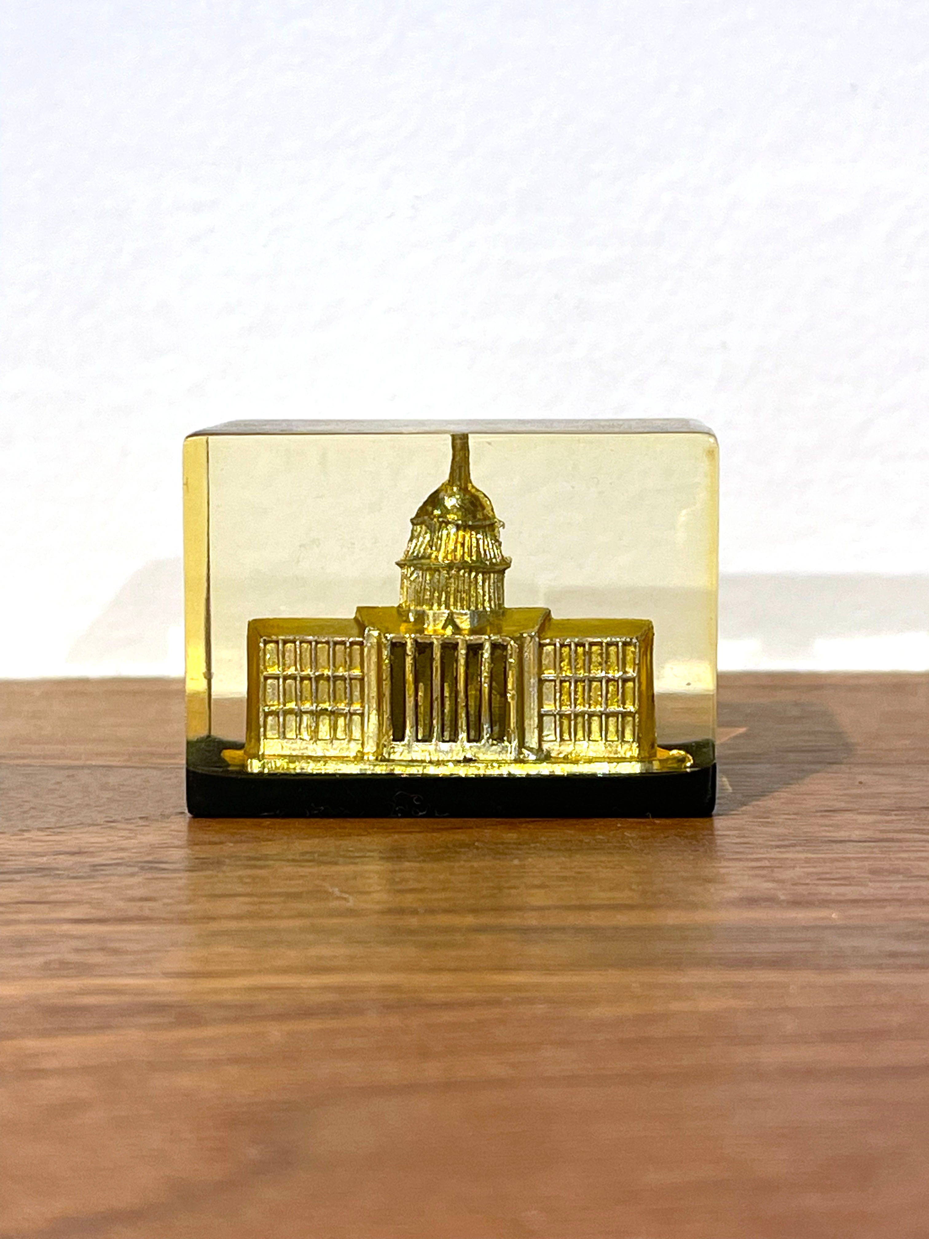 樹脂に閉じ込められたCapitol Hill(米国国会議事堂)のスーべニール・ビルディングです。幅41ミリ、奥行き29ミリ、高さ30ミリです。側面の樹脂に曇っている部分があります。